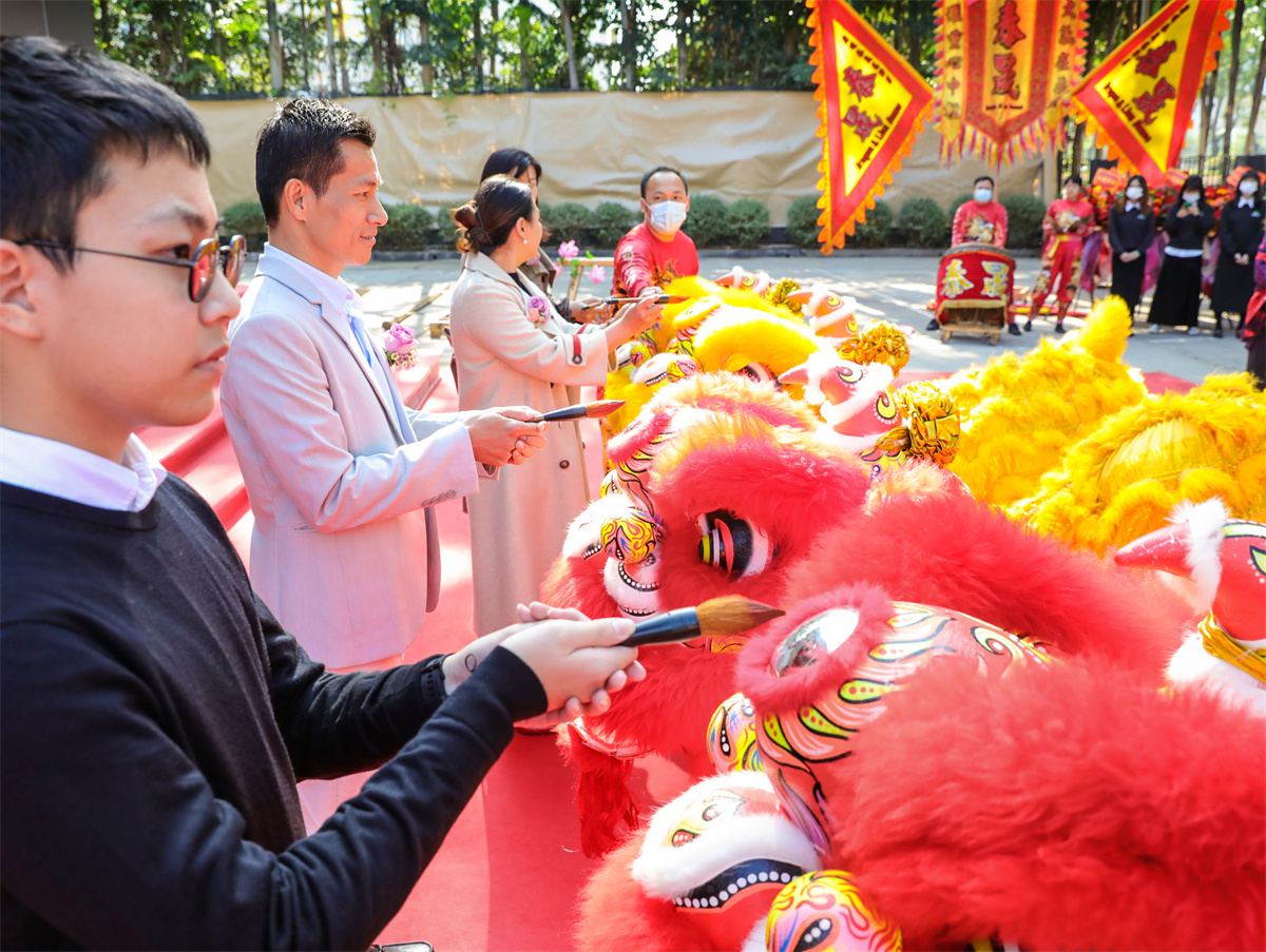 而随着金笔点睛的完成,四头醒狮一跃而起,为现场的观礼嘉宾带来了一场精彩的舞狮采青表演。